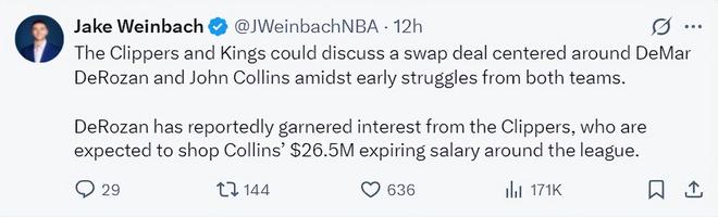 根据NBA记者Jake Winbach的报道,快船与国王可能会围绕德罗赞。科林斯展开交易谈判,两支球队在赛季初的表现都很挣扎,科林斯2650万的到期合同对于国王来说也是一个不错的资产。